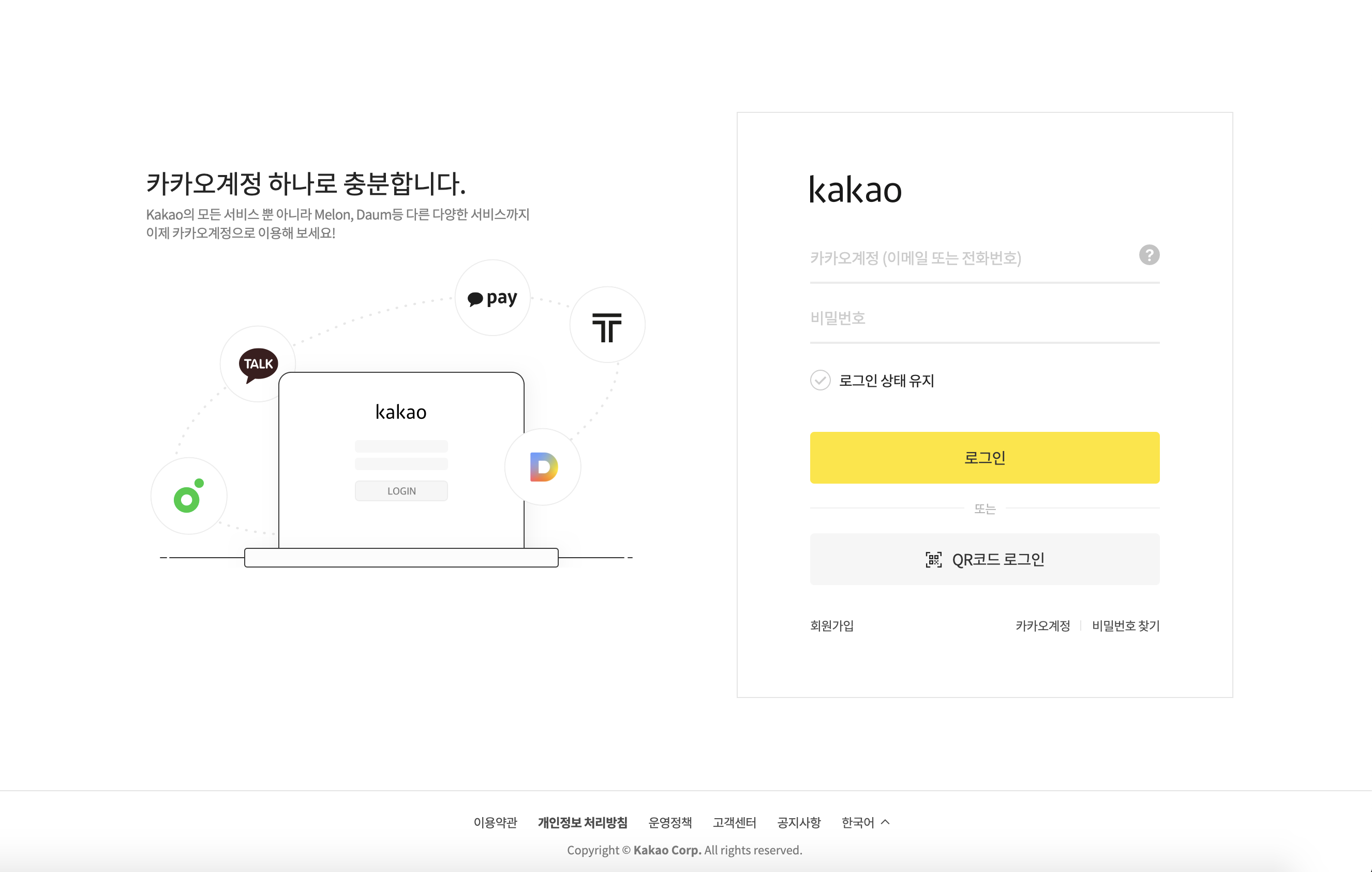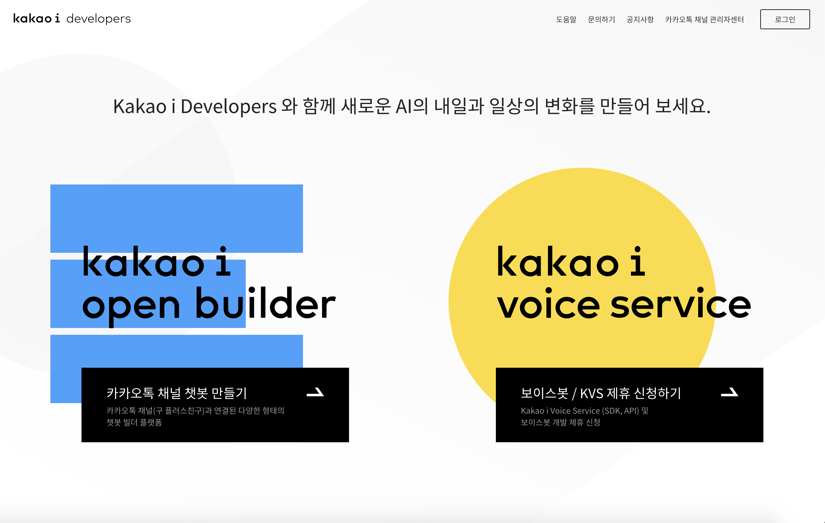 챗봇 및 보이스봇을 만들 수 있다. 보이스봇은 카카오와 제휴가 필요함. 우측 상단의 로그인을 클릭해서 카카오계정으로 로그인한다. 카카오계정이 없으면 회원가입을 해야 한다.